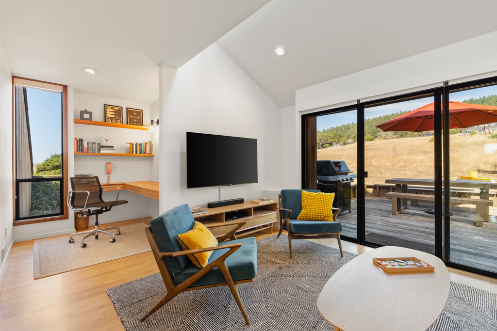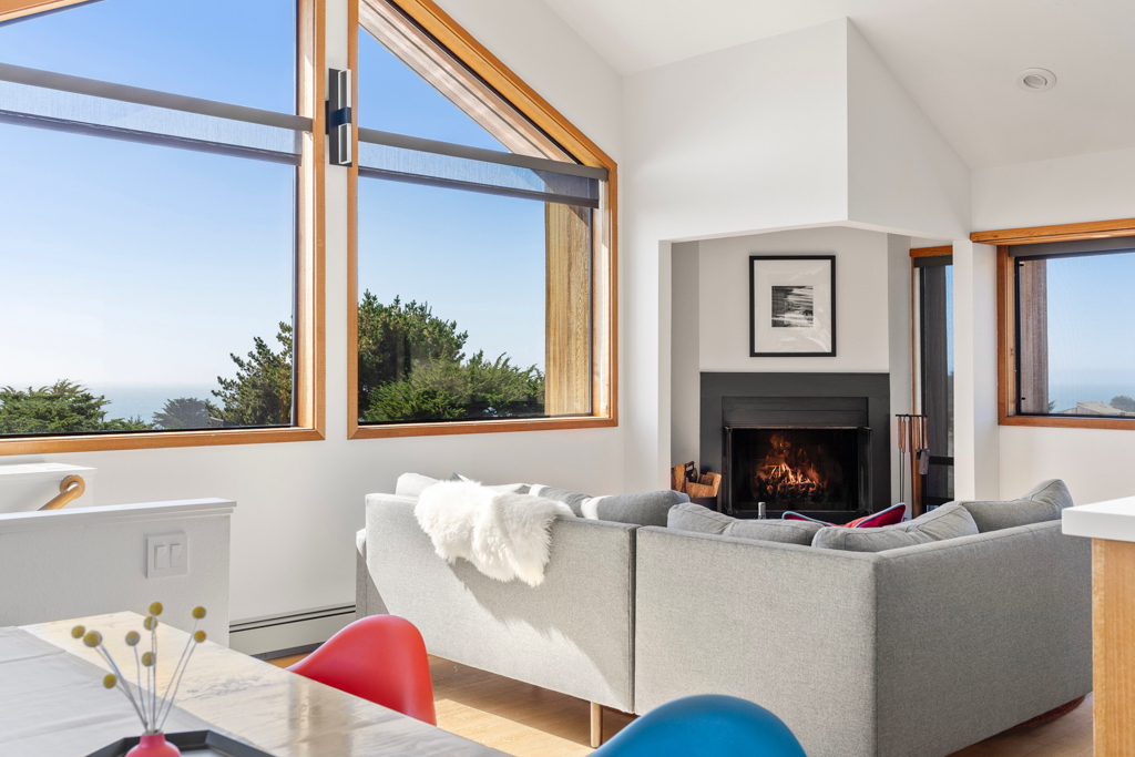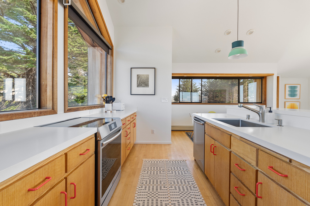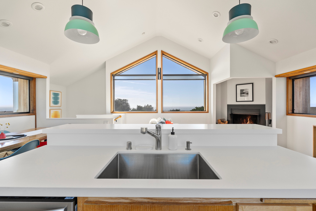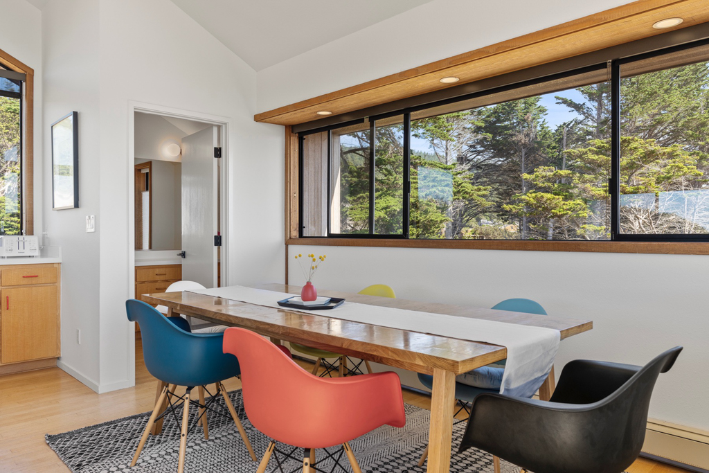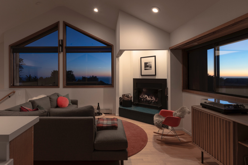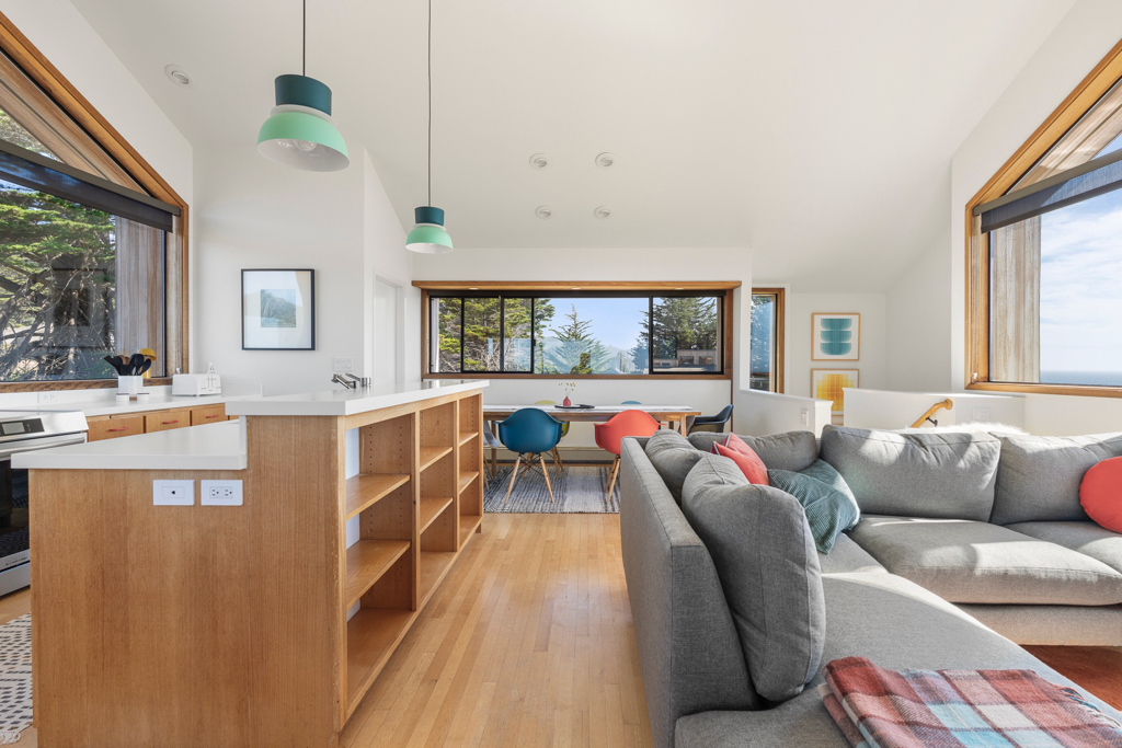This J. Carson Bowler designed home boasts a light-filled great room with cathedral ceilings and a newly remodeled chef’s kitchen upstairs. Take in the views of the meadow and ocean while cooking and dining. Grab a drink, put on a record and get cozy around the wood-burning fireplace.